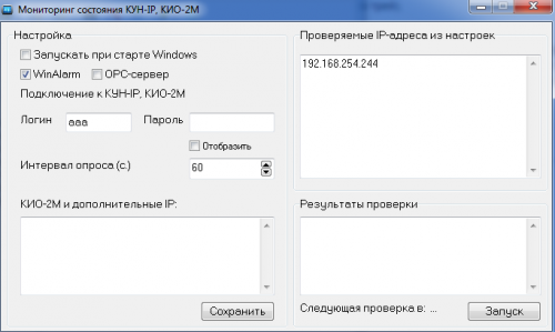 Выбрать режим работы WinAlarm или OPC-сервер, в зависимости от используемого программного обеспечения. После это программа прочитает настройки концетраторов КУН-IP из файлов конфигурации.